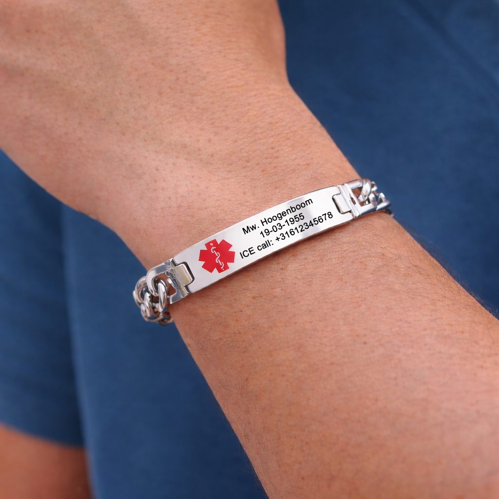 Op de glad afgewerkte plaat kun je essentiële informatie laten graveren, zoals een medische aandoening, allergieën, medicatiegebruik of een noodcontact. Zowel de buiten- als binnenzijde kan gegraveerd worden, zodat je voldoende ruimte hebt om alles duidelijk vast te leggen. Zo ben je altijd voorbereid – voor jezelf én voor de mensen die voor je zorgen.